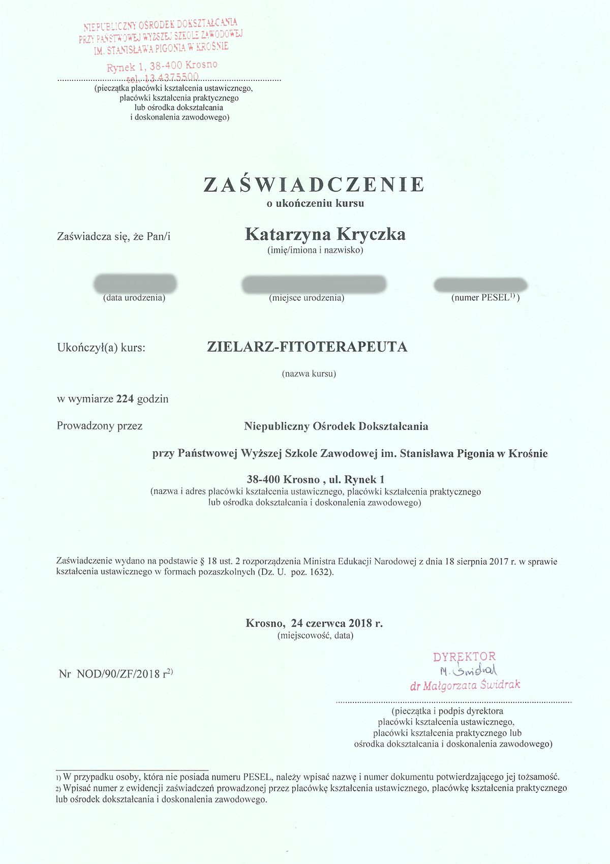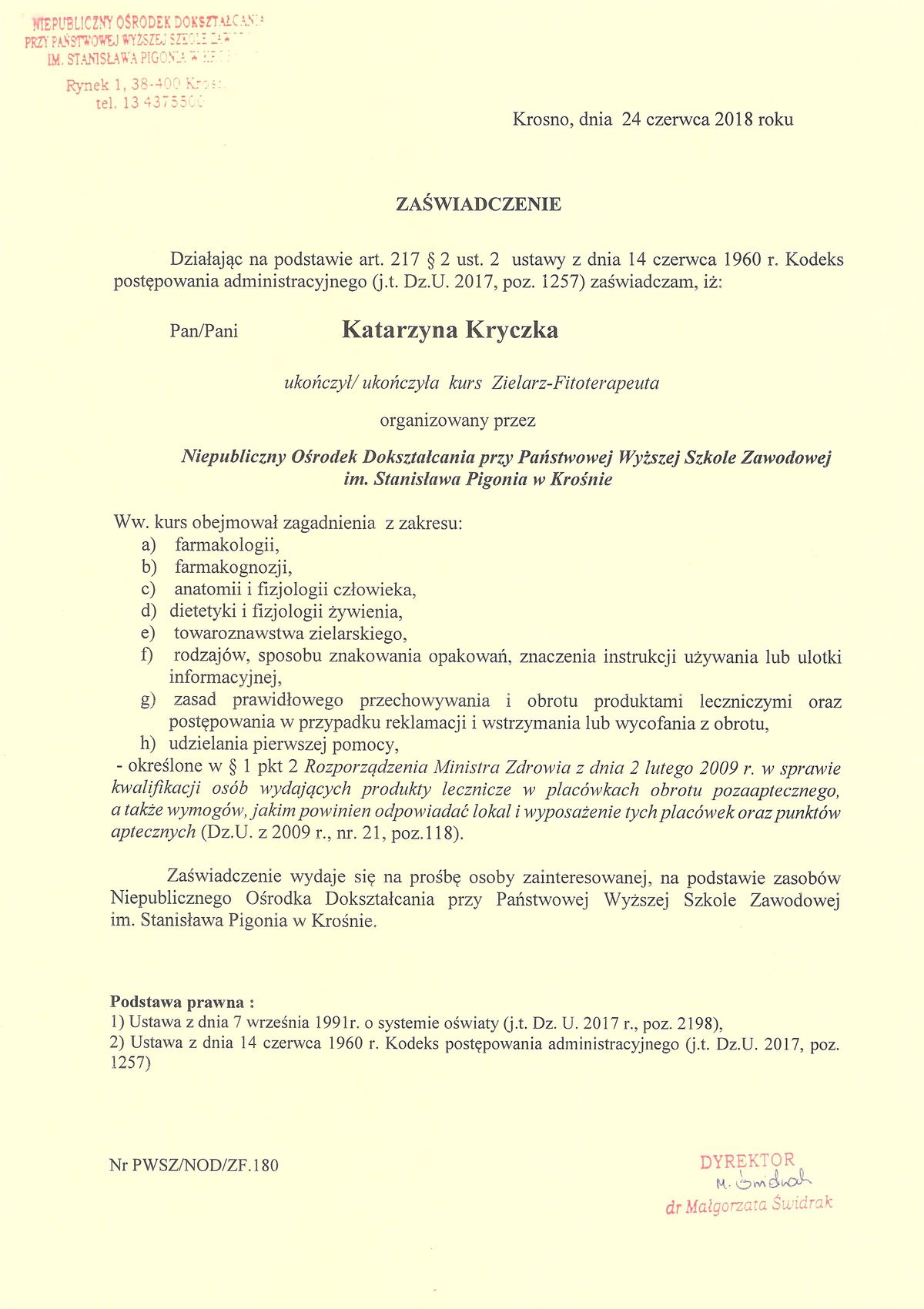 Nazywam się Katarzyna Kryczka, od wielu lat związana jestem z branżą medyczną, a od kilku lat ściślej z ziołolecznictwem. Ukończyłam stacjonarny kurs zielarza fitoterapeuty ( kod zawodu Min. Pracy 323012) w PWSZ w Krośnie, pod okiem najlepszego zielarza w Polsce – dr Henryka Różańskiego. Zarówno prestiżowe szkolenie, jak i późniejsza, wieloletnia praktyka realizowana poprzez prowadzenie swojej zielarni pozwoliły mi na uzyskanie i rozwinięcie potrzebnych kompetencji, by móc skutecznie pomagać pacjentom w rozmaitych dolegliwościach i schorzeniach za pomocą terapii ziołowych. Pragnę również zaznaczyć, że proponowane przeze mnie terapie nie ograniczają się jedynie do ziół, lecz bazują także na preparatach witaminowych oraz zaleceniach dietetycznych.  Prywatnie pasjonuję się podróżami i uwielbiam przebywać na łonie natury, co często dokumentuję fotograficznie.